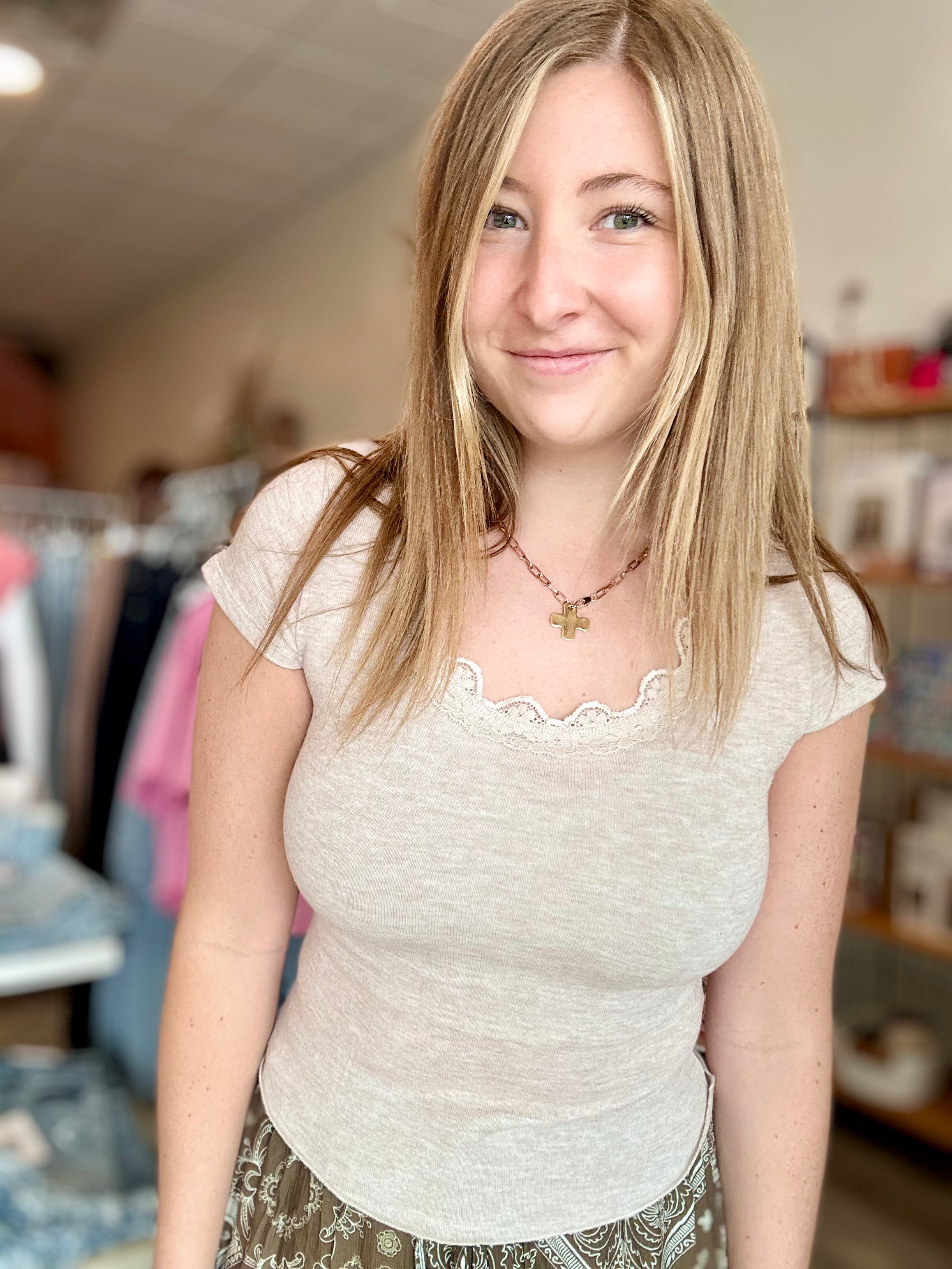 Delicate lace trim meets cozy knit in the Ginny Top—your new go-to for effortless layering or solo styling. Throw it on over a slip dress for an unexpected edge, or wear it bare for a sweet, feminine vibe. Versatile enough for coffee runs and cool enough for nights out, this piece proves that the best wardrobe staples are the ones that work as hard as you do.