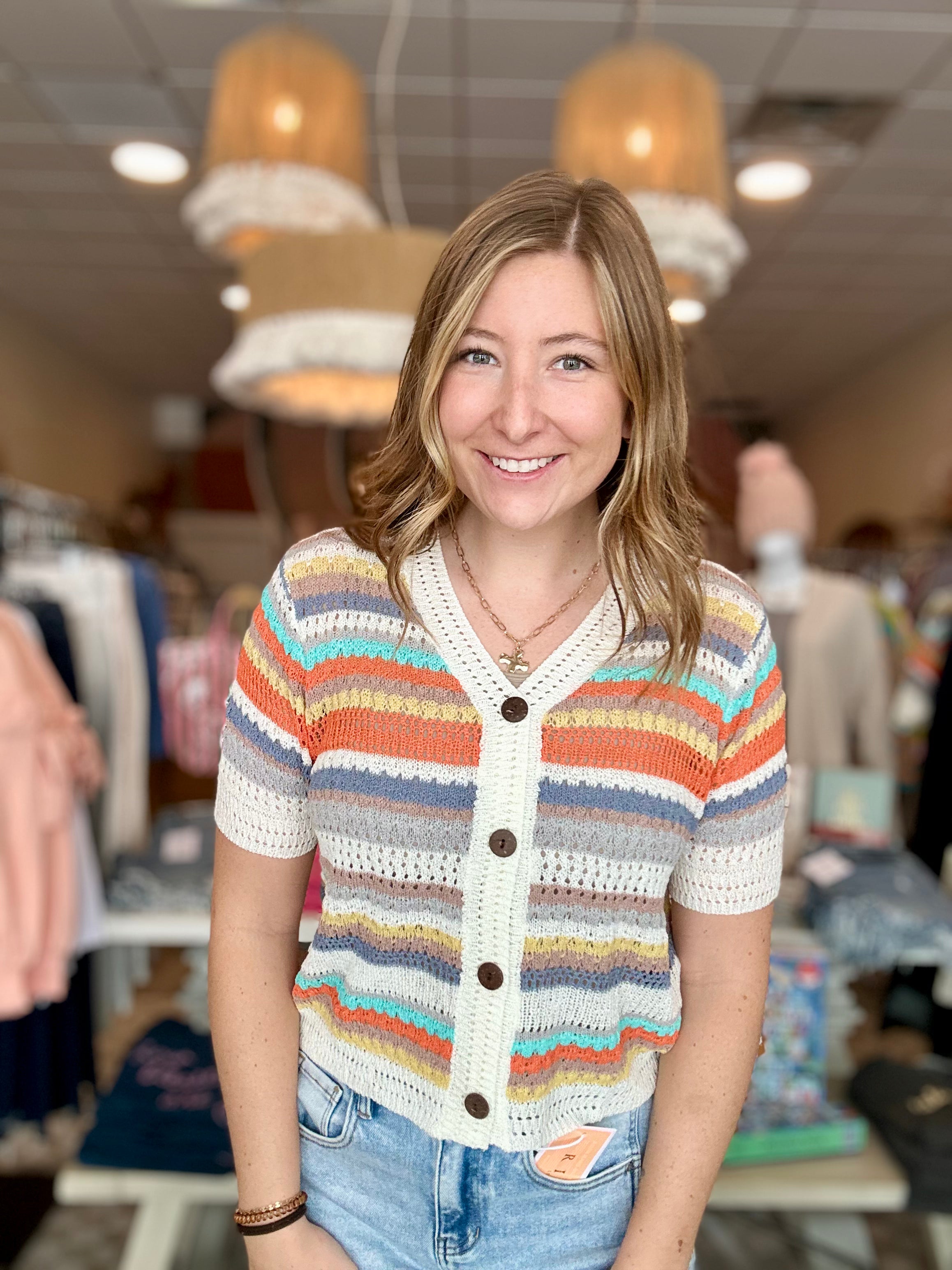 Playful meets practical with the Maggie Top—a multi-color short sleeve sweater that buttons up for effortless layering. Mix and match the vibrant hues with your favorite denim or basics for a look that's equal parts fun and versatile. Whether you're dressing it up or keeping it casual, this colorful essential brings personality to any outfit.