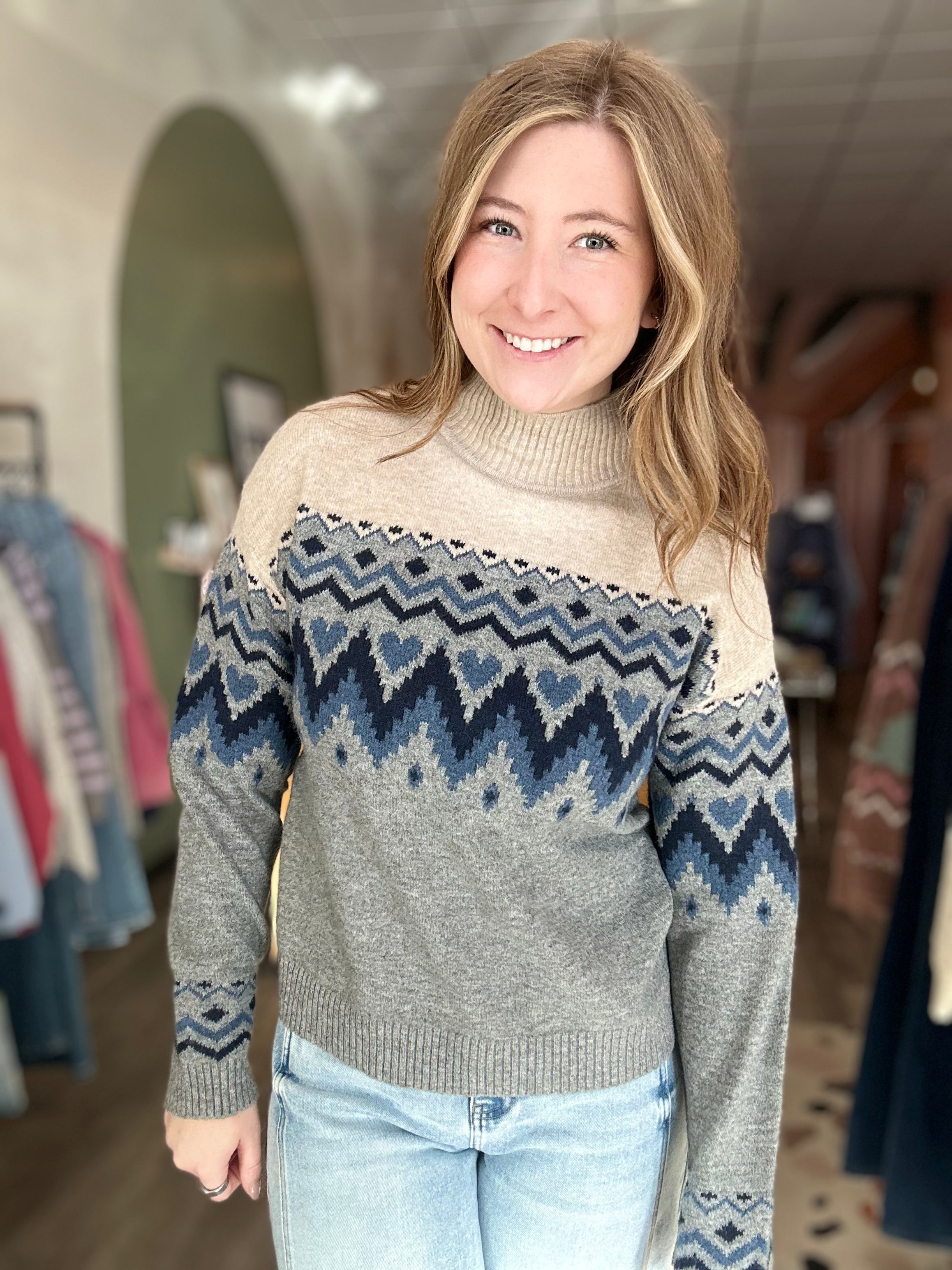 Cozy up in the Justine Sweater, where adorable heart patterns meet a chic mock neck for the ultimate feel-good layer. Perfect for expressing your softer side while staying warm and stylish, this sweater brings a playful touch to any outfit. Whether you're lounging at home or stepping out for the day, it's the kind of piece that makes you smile every time you put it on.