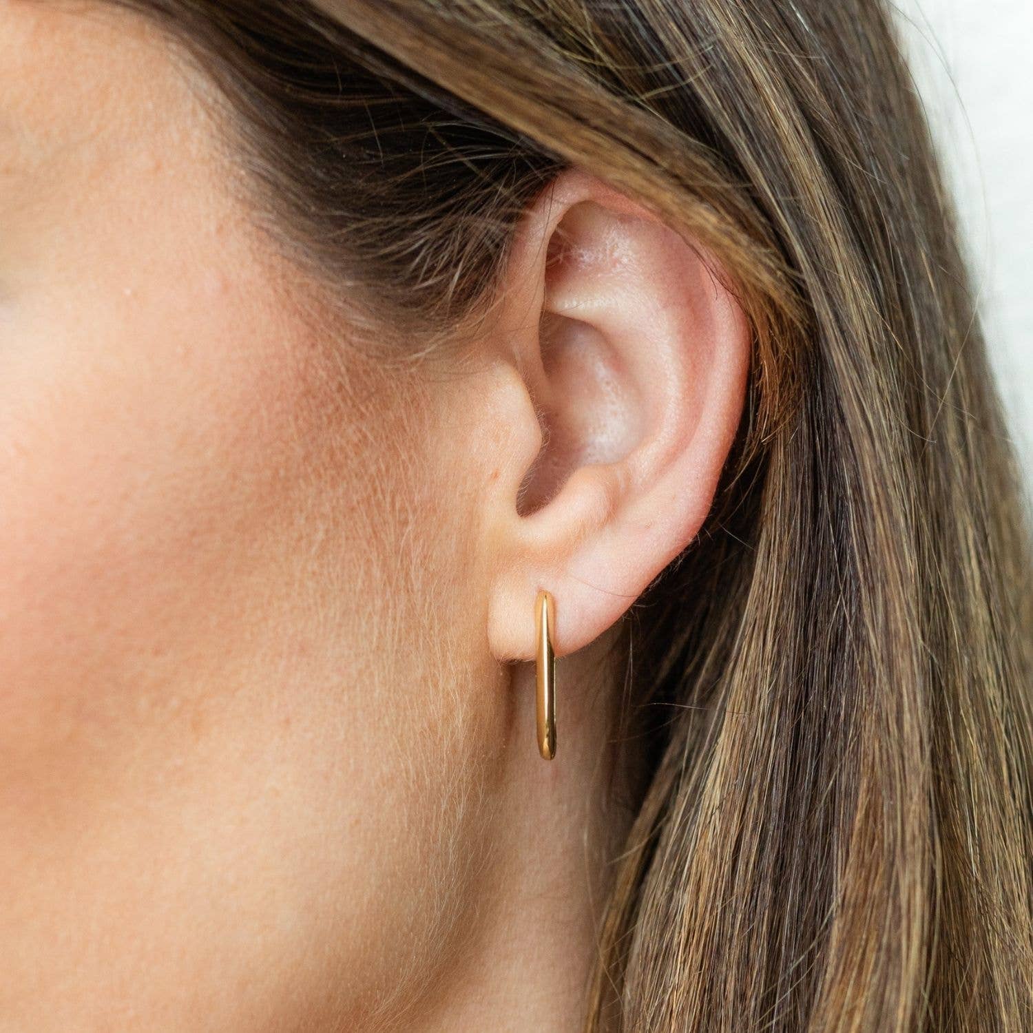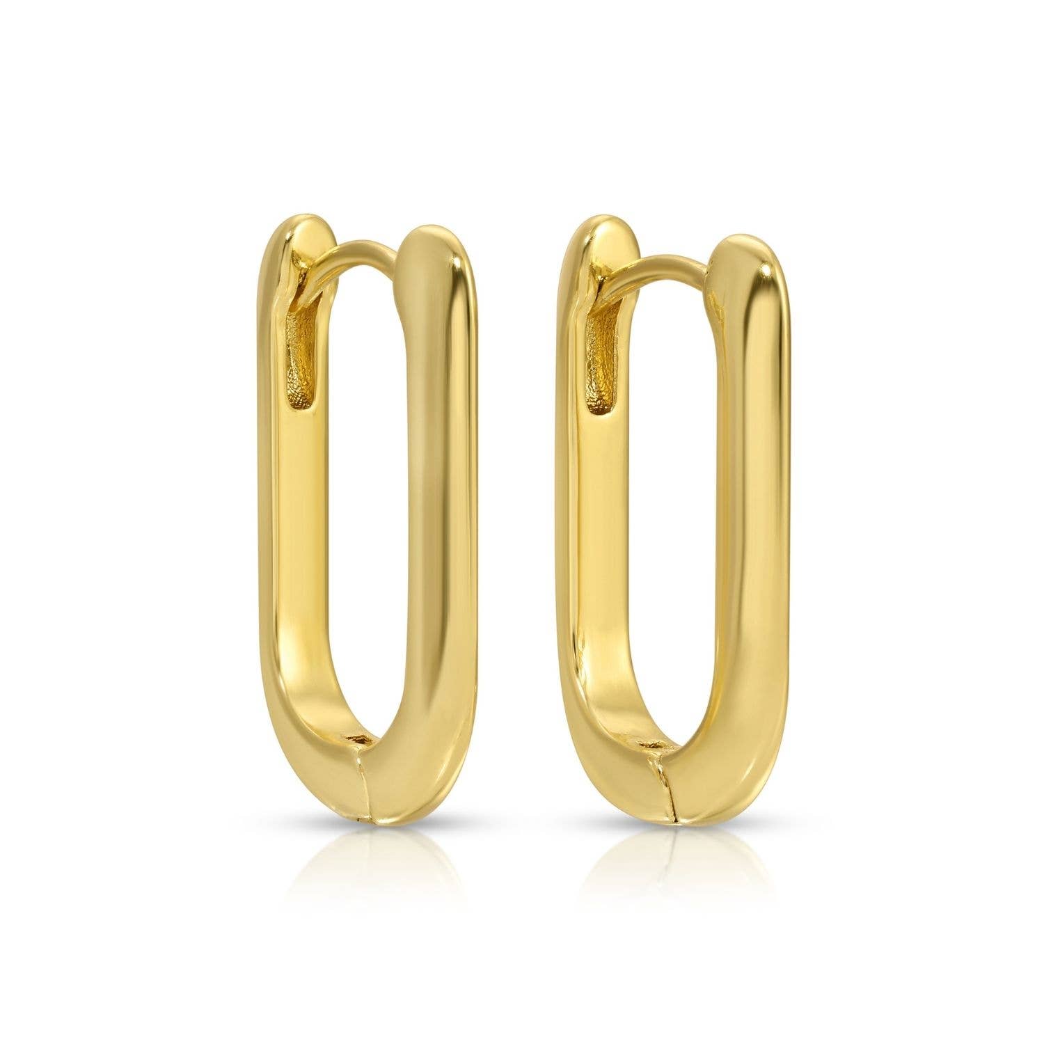 Elevate your earring game with a fresh, modern twist! Our Oblong Huggies offer a sophisticated take on the classic hoop, designed to add unique style and comfortable wear to your everyday look. Meticulously crafted with a brass base, these distinctive huggies are plated with  radiant 18K gold.The 18K gold plating provides a rich, warm luster